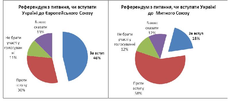 Більшість жителів України надають перевагу проєвропейському напрямку зовнішньої політики України, аніж курсу на приєднання до Митного Союзу: якби у вересні 2015 року відбувався референдум щодо вступу України до того чи іншого геополітичного об’єднання, то за вступ до Європейського Союзу були готові проголосувати 46% дорослих жителів України, а за вступ до Митного Союзу – лише 18%.